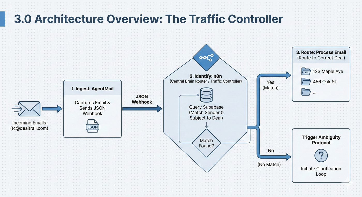 Once the Router identifies the deal (e.g., "This is 123 Maple"), it doesn't just dump the email into a database. It packages the email with Context.