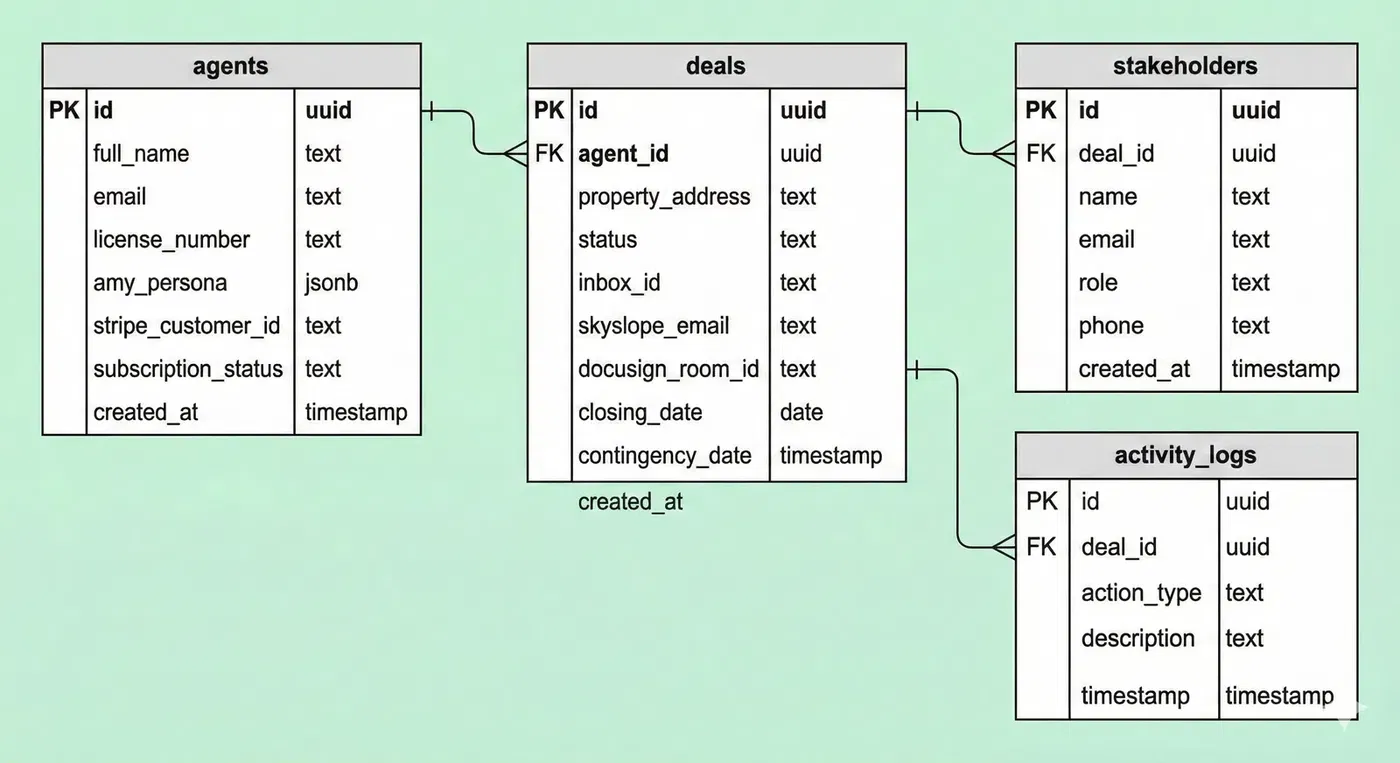 The Master SQL Script -- 1. Setup: Enable UUID generation-- This allows us to create unique IDs for every dealcreate extension if not exists "uuid-ossp"; -- 2. Create the AGENTS table-- This links to the built-in Supabase Auth systemcreate table public.agents ( id uuid references auth.users not null primary key, full_name text, email text, license_number text, -- Settings for "Amy" amy_persona jsonb default '{"tone": "professional", "latency": "medium"}', -- Billing stripe_customer_id text, subscription_status text default 'active', created_at timestamp with time zone default timezone('utc'::text, now()) not null); -- 3. Create the DEALS table-- The container for every transactioncreate table public.deals ( id uuid default uuid_generate_v4() primary key, agent_id uuid references public.agents(id) not null, -- Property Info property_address text not null, status text default 'pending_setup', -- active, pending, closed, cancelled -- The External Links (The Integrations) inbox_id text, -- AgentMail ID skyslope_email text, -- For filing docusign_room_id text, -- For forms -- Critical Dates (Extracted by AI) closing_date date, contingency_date date, created_at timestamp with time zone default timezone('utc'::text, now()) not null); -- 4. Create the STAKEHOLDERS table-- The Rolodex. This is how Amy knows who is emailing her.create table public.stakeholders ( id uuid default uuid_generate_v4() primary key, deal_id uuid references public.deals(id) not null, name text, email text not null, role text not null, -- 'lender', 'buyer', 'seller_agent' phone text, created_at timestamp with time zone default timezone('utc'::text, now()) not null); -- 5. Create the LOGS table-- An audit trail of everything Amy does (for liability)create table public.activity_logs ( id uuid default uuid_generate_v4() primary key, deal_id uuid references public.deals(id), action_type text, -- 'email_sent', 'doc_filed', 'draft_created' description text, timestamp timestamp with time zone default timezone('utc'::text, now()) not null); -- 6. Enable Row Level Security (The Safety Lock)-- This ensures Agent A cannot read Agent B's dealsalter table public.agents enable row level security;alter table public.deals enable row level security;alter table public.stakeholders enable row level security; -- 7. Create Security Policies-- Policy: "Agents can view their own deals"create policy "Agents can view their own deals" on public.deals for select using ( auth.uid() = agent_id ); -- Policy: "Agents can update their own deals"create policy "Agents can update their own deals" on public.deals for update using ( auth.uid() = agent_id ); -- Policy: "Agents can view their own stakeholders"create policy "Agents can view stakeholders" on public.stakeholders for select using ( exists ( select 1 from public.deals where public.deals.id = public.stakeholders.deal_id and public.deals.agent_id = auth.uid() ) );