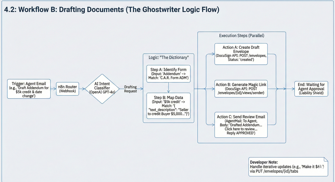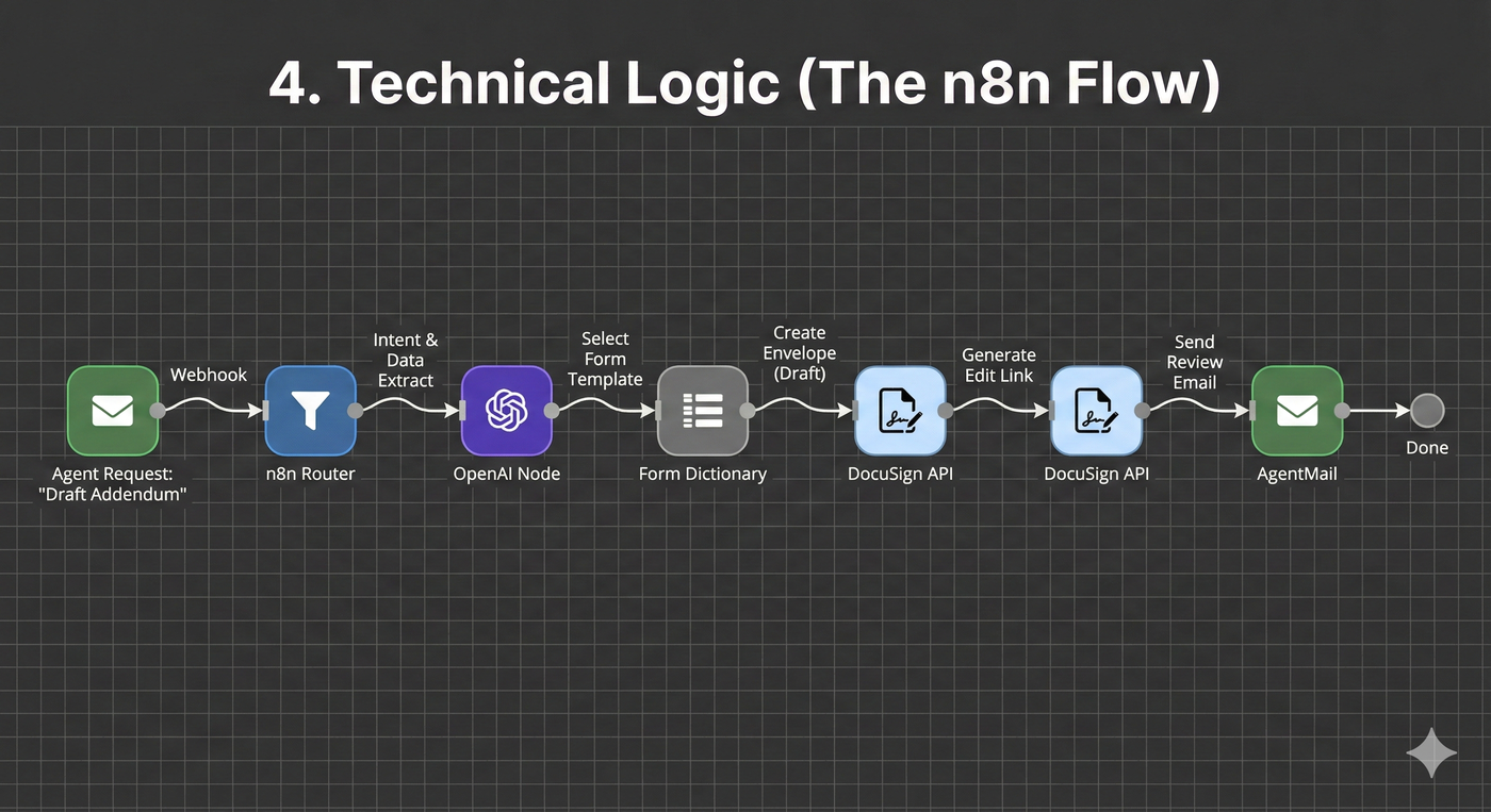 graph TD A[Agent Request: 'Draft Addendum'] -->|Webhook| B(n8n Router) B -->|Intent & Data Extract| C{OpenAI Node} C -->|Select Form Template| D[Form Dictionary] D -->|Create Envelope (Draft)| E[DocuSign API] E -->|Generate Edit Link| F[DocuSign API] F -->|Send Review Email| G[AgentMail]